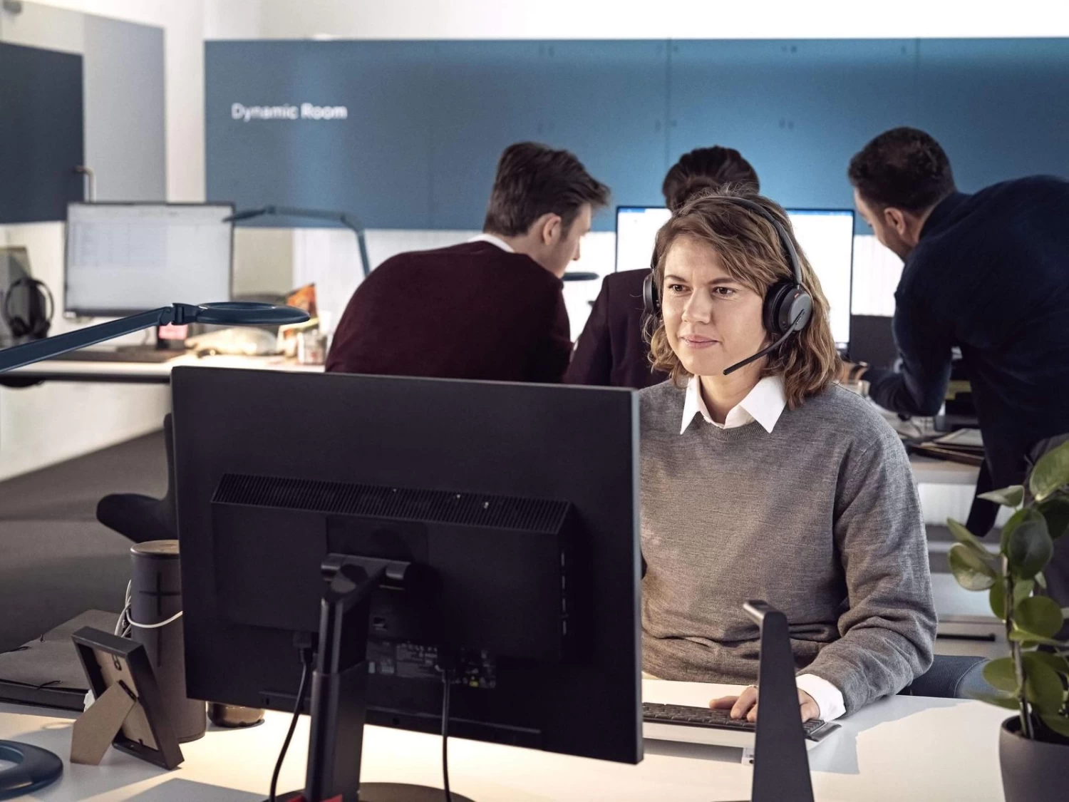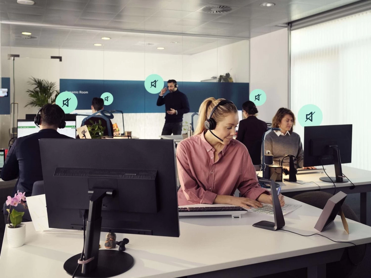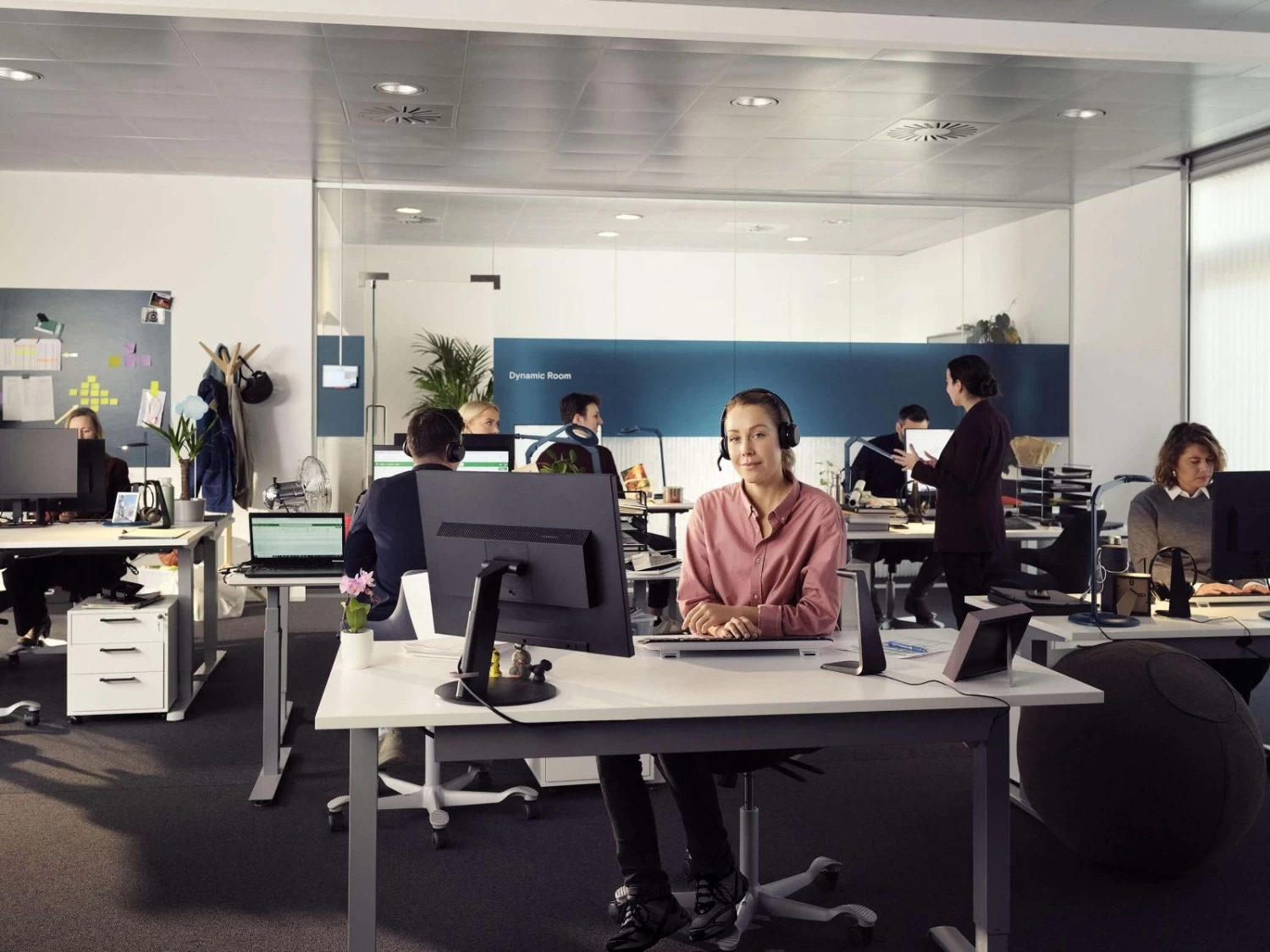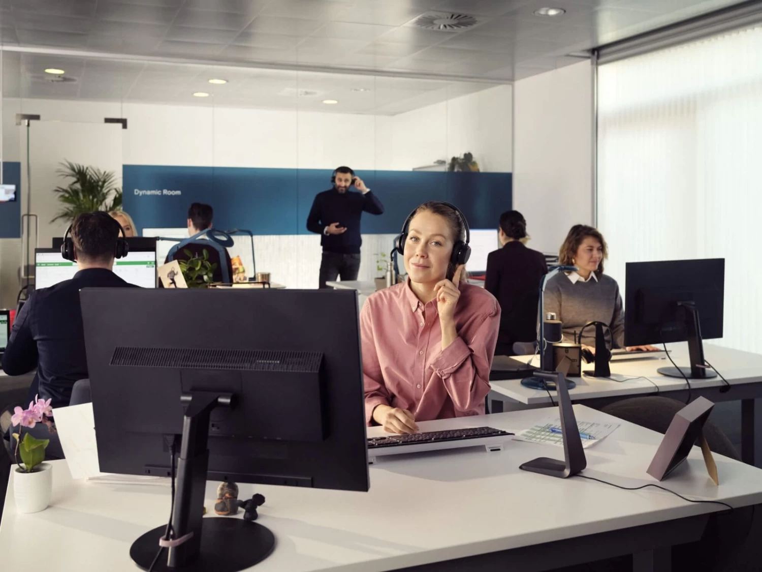 Lightweight design, soft breathable cushions, and headband padding allow for all-day wearing comfort in the open office.