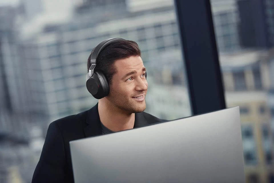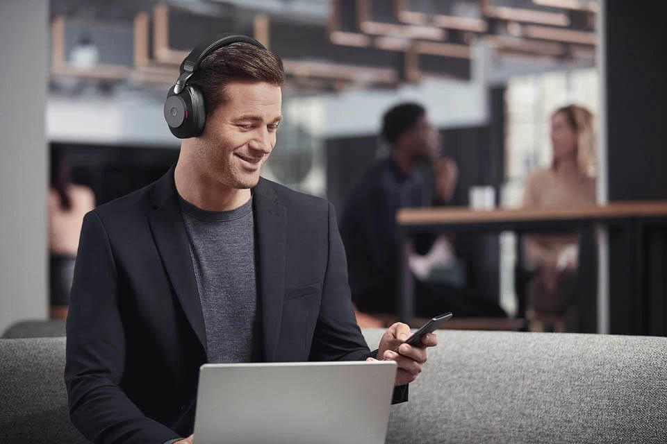 The very top end of Jabra’s new Evolve2 series, the Evolve2 85 range are designed to work with PC/Mac and Mobile phone. They connect to a computer or laptop via the included USB dongle (USB-A or USB-C) and directly to your smartphone with Bluetooth They have ACTIVE noise cancelling earcups to help block out background noise for the user.