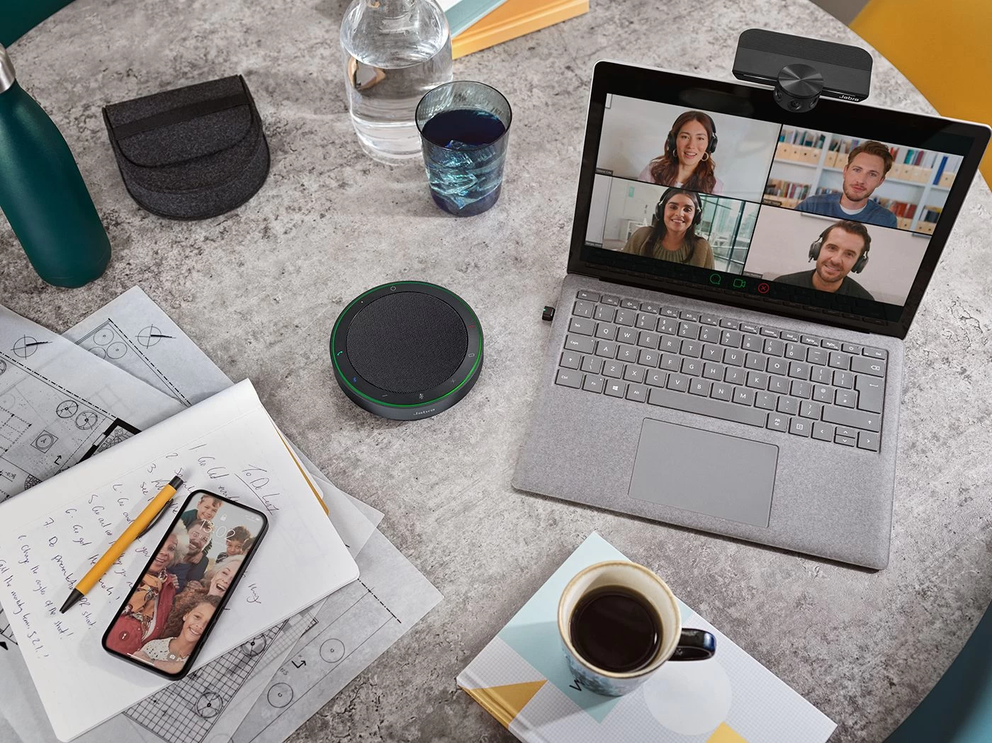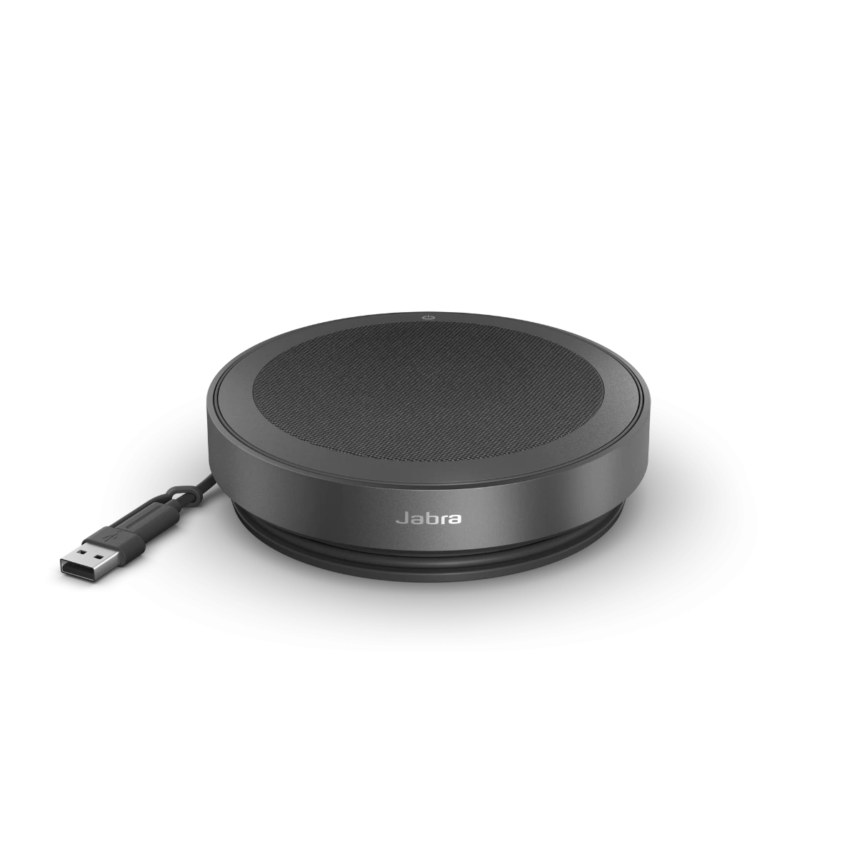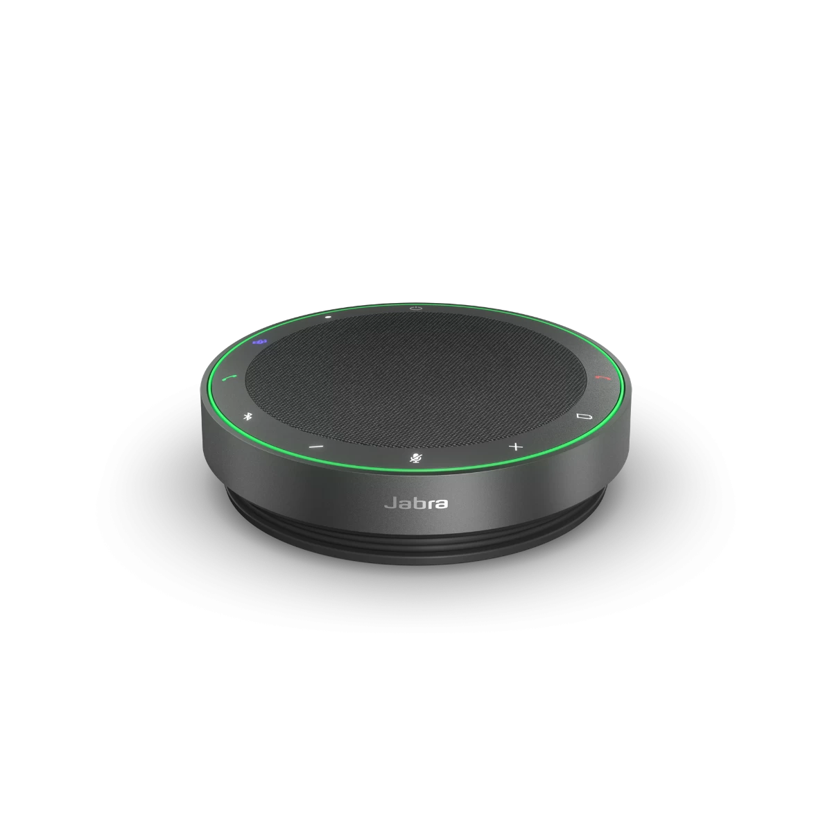 The Speak2 75 is a portable speakerphone designed to connect to Laptop/PC via Bluetooth USB dongle (USB-A or C, depending on the variant) and to mobile via Bluetooth.