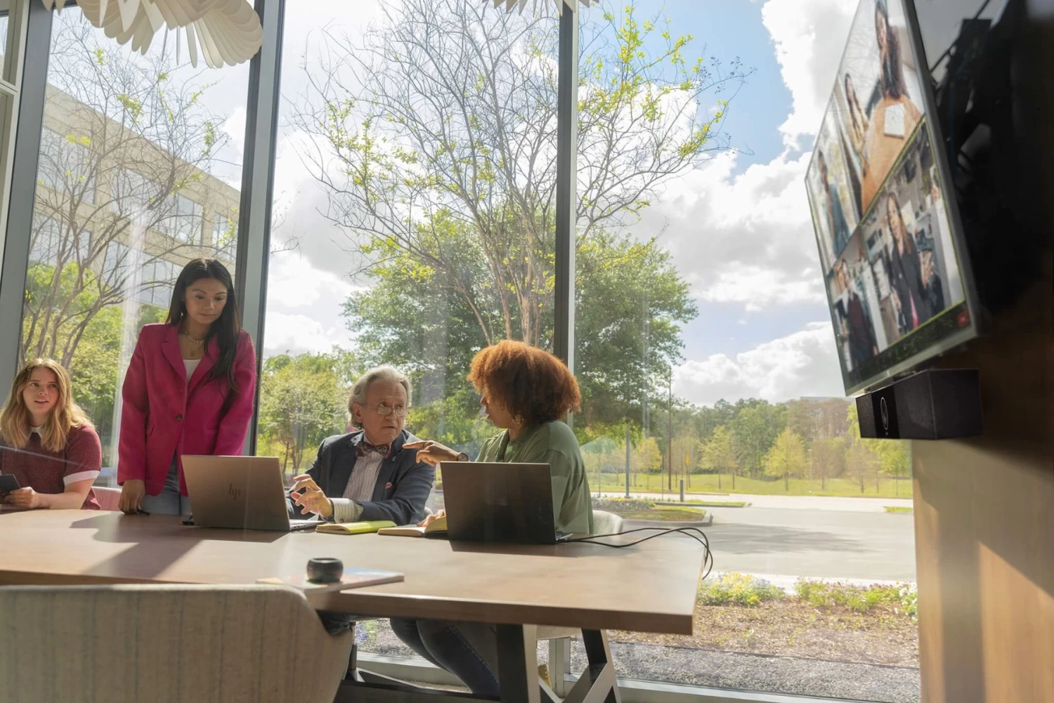 Automatic group framing intelligently frames participants, adjusting automatically as they enter and leave the room to ensure everyone is seen clearly. Features like innovative NoiseBlock and Acoustic Fence technology senses background noise and blocks it so calls are clear.